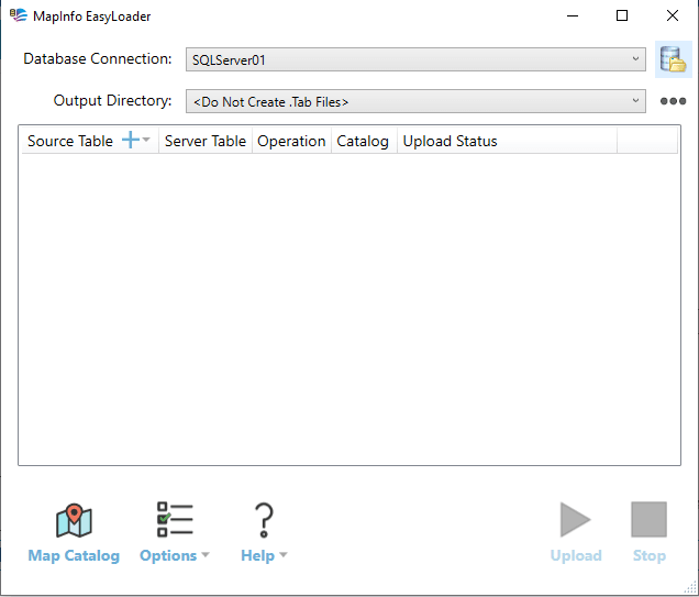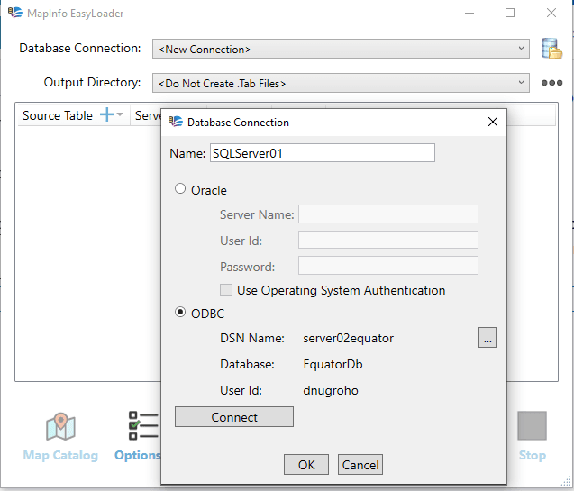 Click Connect and then OK. Next, click MapInfo Mapcatalog button to create the table.