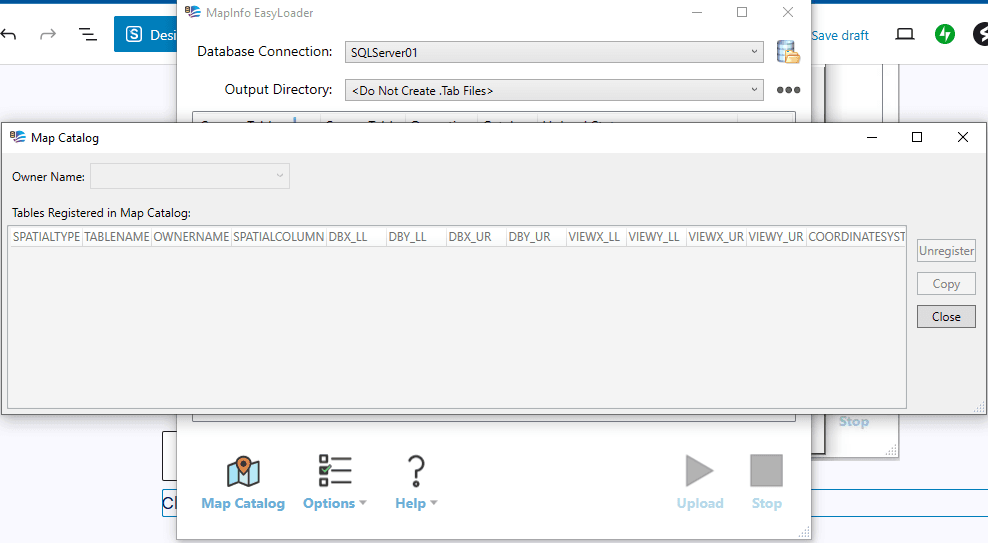 Now you have the Mapinfo Mapcatalog table in your database and you can start uploading the spatial data to the database.