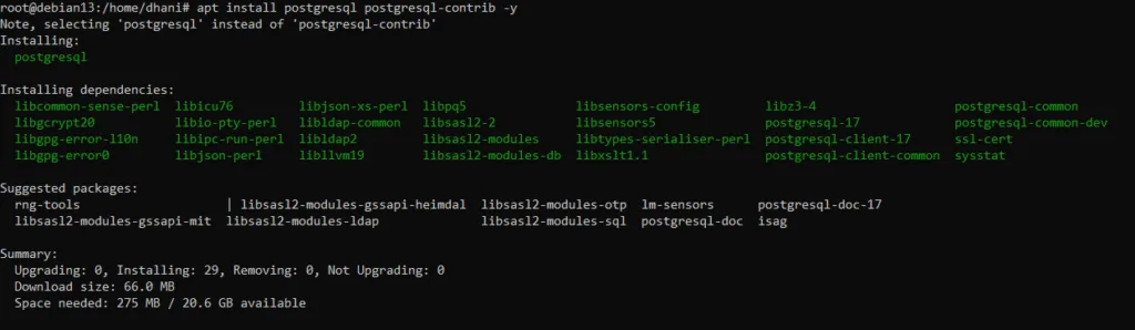 Now, we can install PostgreSQL. The default Debian repositories include a postgresql package, which provides the server, and postgresql-contrib, which includes extra utilities. We’ll install both.