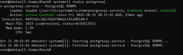 At this point, we have successfully installed PostgreSQL on Debian 13. Next, we will configure the remote connection to PostgreSQL.